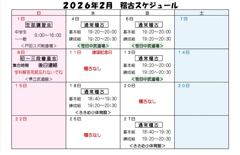 まだまだ寒いですが、明日はいよいよ立春!今月は、学年末テストや入学試験など、大事時間を過ごさなければならないので、稽古日少なめですが、元気に春を迎えたいと思います😆中学生は、試合も行っていきます。インフルエンザB型、なんだか爆流行りのようなので、みなさん、感染症対策忘れずに。今月も爽風舘をよろしくお願いいたします🙇♀️