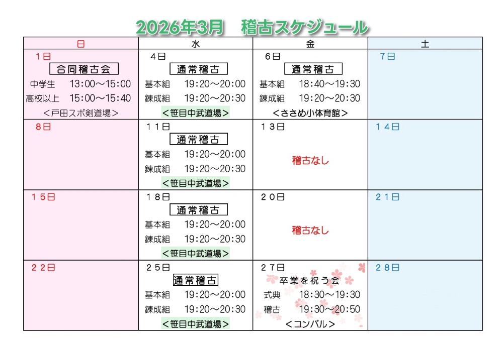 2026年3月の稽古スケジュール